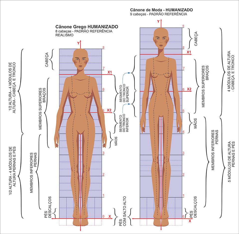 Outra observação da figura 21, é que a grade estrutural para o desenho do corpo humano feminino adulto na proposta do cânone grego (referência para o cânone de moda) tem 8 cabeças de altura, no segundo módulo está localizada a largura do corpo, igual a duas cabeças. O cânone do desenho de moda tem 9 cabeças de altura, no segundo módulo é localizada a largura do corpo, igual a duas cabeças.
