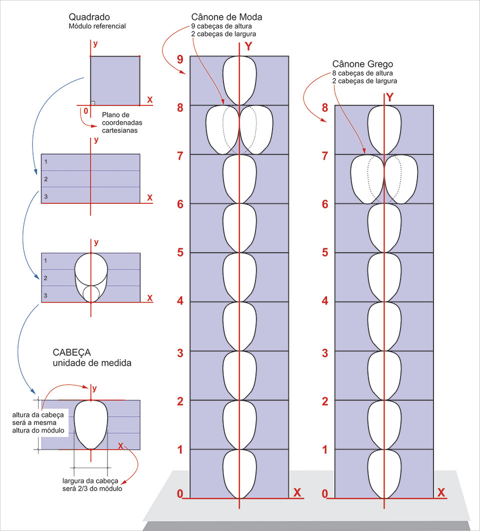 Na direita da figura 4, estão representados os dois quadrantes superiores (primeiro e segundo) que são usados como base para traçar a grade estrutural para localização e posição das medidas, direção, simetria e equilíbrio dos cânones do corpo humano. A grade estrutural é centralizada no encontro das linhas perpendiculares ''X' e 'Y'', identificada pelo ponto zero. O módulo padrão é o quadrado que se repete na horizontal formando duas colunas; com variação de repetição para composição do corpo humano a ser representado. No centro das colunas está localizado o eixo 'Y' para determinar a linha de equilíbrio e simetria do corpo; na base horizontal está o eixo 'X' (figura 4), onde é localizado o ponto zero para localização dos pés descalços do cânone feminino adulto (matriz para os demais cânones). Estes estudos serão aprofundados na sequência deste capítulo e no capítulo Desenhar.