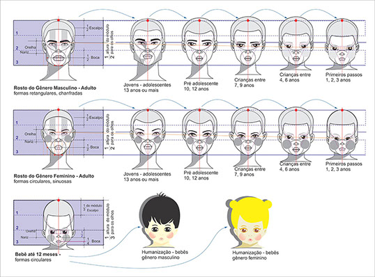 Para desenvolver o desenho da cabeça dos demais cânones femininos de acordo com as faixas etárias, bem como os masculinos, podem ser mantidas as mesmas dimensões do módulo da cabeça (um módulo de altura e dois terços de largura), conforme proposta apresentada na figura 23, as partes serão projetadas e distribuídas de maneira adequada a cada gênero e faixa etária.