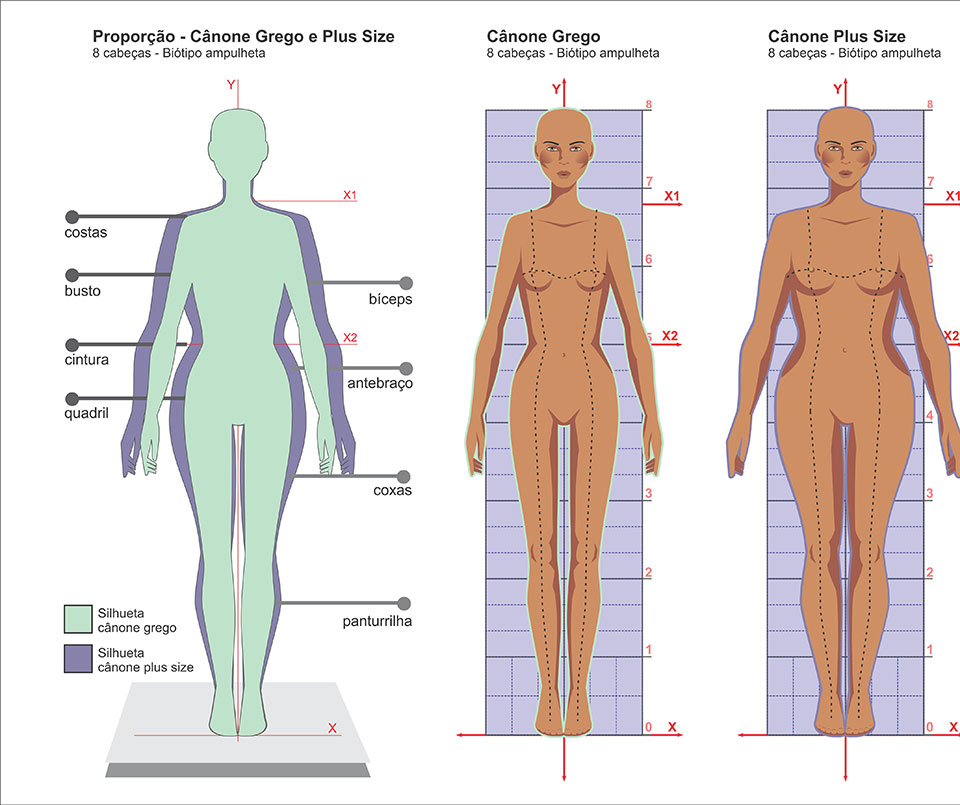 A moda do século XX, instituiu padrões de beleza (principalmente feminina) de pessoas altas, brancas e magras. Atualmente, esses padrões têm sido questionados e, para ampliar a liberdade de expressão nas representações gráficas e trabalhar com a diversidade, é fundamental desenvolver vários biótipos e massa corporal , e utilizar uma referência, a exemplo do cânone grego (figura 24), para aprimorar e compreender que existem inúmeras silhuetas corpóreas, e há inúmeras possibilidades para personalizar suas habilidades gráficas.