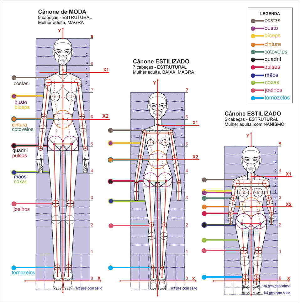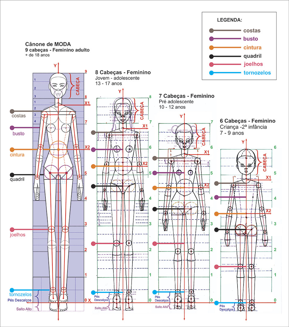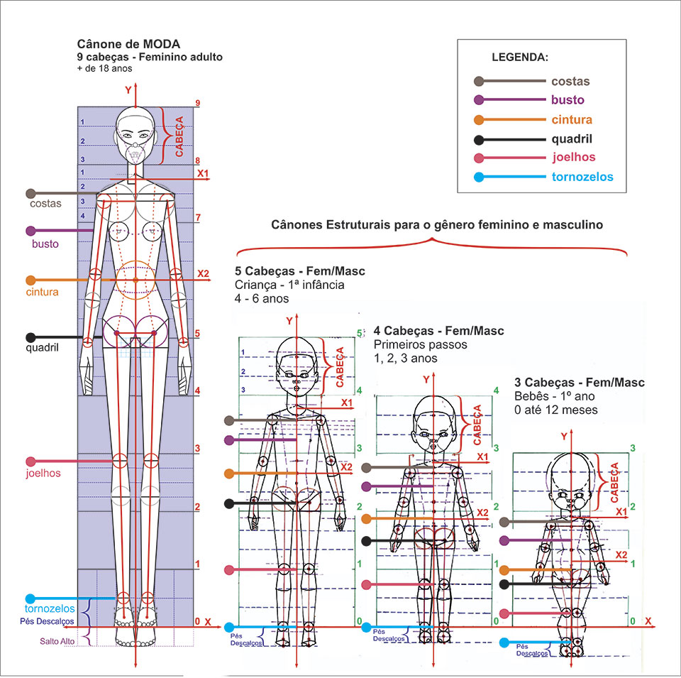 A figura 28, apresenta o cânone de moda feminino adulto (9 cabeças), como referência para a construção dos cânones estruturais com cinco, quatro e três cabeças que atendem ao gênero feminino e masculino. O cânone para crianças da primeira infância (idade entre seis e quatro anos) com 5 cabeças; primeiros passos (idade entre três e um ano) com 4 cabeças e o bebê (idade entre onze meses e recém-nascidos) com 3 cabeças. Na composição de alguns cânones, a estrutura dos pés fica abaixo do eixo 'X' para facilitar a composição do corpo.