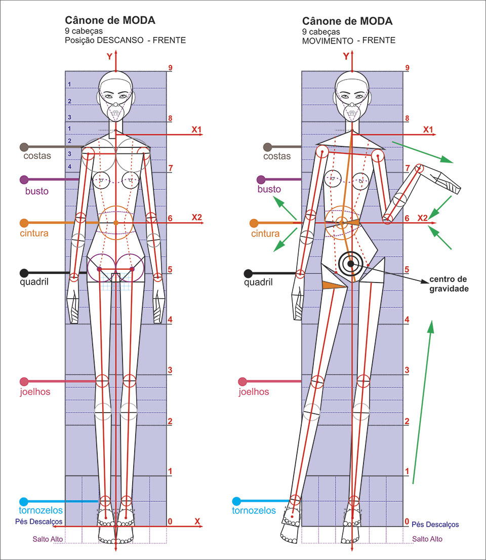 A figura 26, apresenta o cânone de moda com 9 cabeças na posição de descanso; em destaque estão as linhas de costas, busto, cintura, quadril, joelhos, tornozelos e pés. Estas linhas destacadas têm alterações em relação ao eixo 'Y' e, com o movimento simples de apoiar o peso do corpo sobre uma das pernas, é possível perceber que formam ângulos diferentes. No cânone em movimento (à direita) (ver detalhes no capítulo Desenhar), percebe-se o movimento do centro de gravidade na região do quadril, apoiando o peso do corpo sobre a perna esquerda. Quando há movimento no tronco inferior, automaticamente o tronco superior converge (setas na cor verde) para o lado esquerdo, na direção do quadril. A perna direita move-se para estabilizar o corpo, o tronco superior (lado direito do corpo) fica em posição divergente (setas na cor verde) do tronco inferior. Com o movimento do tronco é revelada a linha da coluna vertebral (na cor laranja), antes sobreposta ao eixo 'Y'. Por último os braços e mãos são movimentados para equilibrar o corpo.
