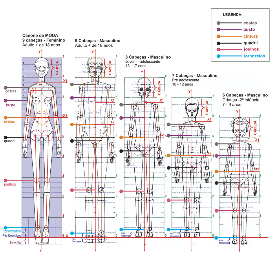 A sugestão para compor as representações gráficas para o cânone masculino, propostas na figura 29, propõe a figura de moda para as jovens e adolescentes (idade entre treze e dezessete anos) com 8 cabeças; as pré-adolescentes (idade entre dez e doze anos) com 7 cabeças e as crianças da segunda infância (idade entre sete e nove anos) com 6 cabeças. As larguras do corpo, estão relacionadas à largura da cabeça; a altura do módulo da cabeça é a mesma para todos os cânones. A cabeça é a unidade de medida para compor a altura o corpo, respeitando a faixa etária, a numeração está à direita das grades. As linhas coloridas, à esquerda de cada um dos cânones, identificam as partes do corpo que devem ser observadas com atenção no tronco e membros, conforme a descrição na legenda do infográfico.