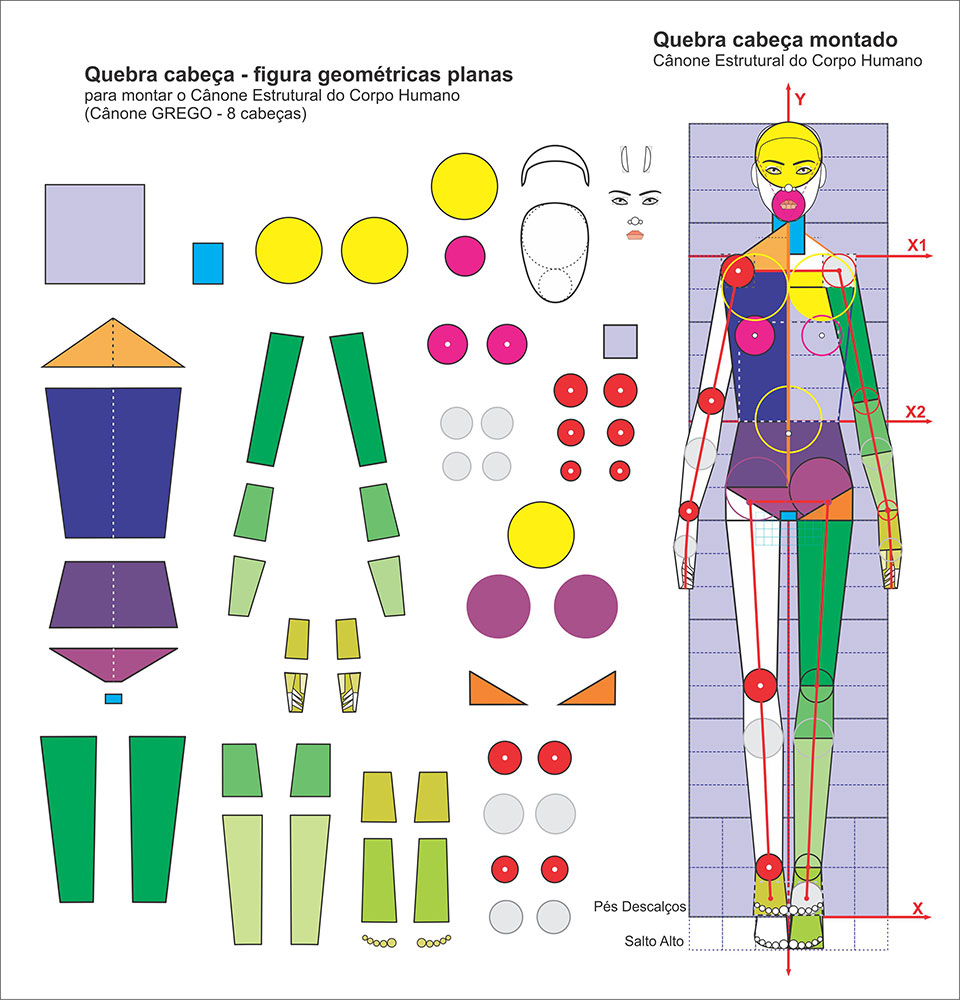 O cânone estrutural feminino, com 9 cabeças está à esquerda da figura 29, estrutura referencial para a composição dos cânones do gênero masculino adulto e principais fases do crescimento, do bebê à fase adulta (ver detalhes no capítulo Desenhar).