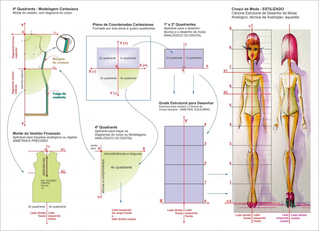 Identificamos os principais conceitos da matemática, como a geometria descritiva, com foco no sistema cartesiano e a projeção mongeana (X, Y, Z), utilizada para a representação de objetos de três dimensões em um plano bidimensional. Conectando a outros conhecimentos construídos na educação básica como a anatomia humana, a biomecânica, ergonomia e arte viabilizaram o desenvolvimento do método “cânones estruturais para o desenho de moda”.